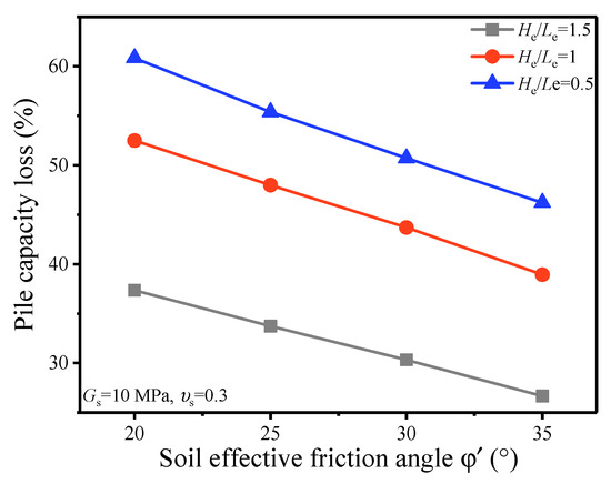 Figure 14 shows the relationship between pile uplift capacity loss and the soil effective friction angle φ′. It can be seen in this figure that the pile uplift capacity loss decreases linearly with the soil effective friction angle increases. When the effective pile length is equal to the excavation depth, i.e., He = Le, the pile capacity loss decreases from 52.5% to 38.9%, with the soil effective angle increasing from 20° to 35°. The ratio of the excavation depth to the effective pile length, i.e., He/Le, also has a significant effect on pile capacity loss. When the soil effective friction angle is 30°, the pile capacity loss increases from 30.3% to 50.7%, with the ratio of the excavation depth to the effective pile length decreasing from 1.5 to 0.5.