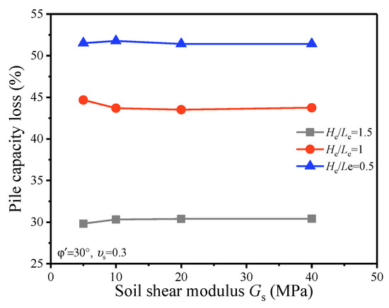 Figure 15 shows the relationship between pile uplift capacity loss and the soil shear modulus Gs. It can be seen in this figure that the pile uplift capacity loss is not affected by the soil shear modulus. The soil shear modulus mainly affects the initial stiffness of the pile–soil interface, as shown in Figure 3. When the load increases to the uplift load, a sizeable pile–soil displacement occurs. Thus, the soil shear modulus hardly affects the pile capacity.