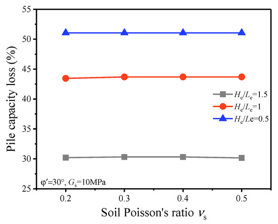 Figure 16 shows the relationship between pile uplift capacity loss and the soil Poisson’s ratio νs. It can be seen in this figure that the pile uplift capacity loss is not affected by the soil Poisson‘s ratio. Similarly, with decreasing ratio of the excavation depth to the effective pile length, the pile capacity loss increases.
