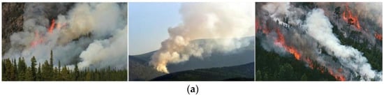 The DCN_Fire model was used to identify forest fire images and verify the effectiveness and rationality of the classification of the forest fire risk from aerial images (Figure 8). Since the smoke features in the smoke (Figure 8c) and mist (Figure 8d) images were highly similar, DCN_Fire mistakenly classified forest mist images as fire risk images. This was not surprising as humans can also mistakenly identify mist as smoke.