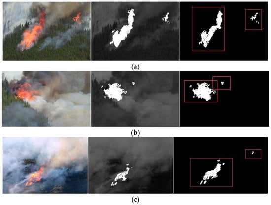 Figure 2a shows the original forest fire images while Figure 2b exhibits the results of significance detection. As shown in Figure 2c, the proposed significance method effectively located the core flame area in the aerial images and even very small ignition areas. In addition, Figure 2d shows that the original image was segmented into independent flame images containing complete flame features using the proposed method. Data enhancement could effectively solve the over-fitting problem caused by using a small training data set. Figure 3 shows examples of the test results.