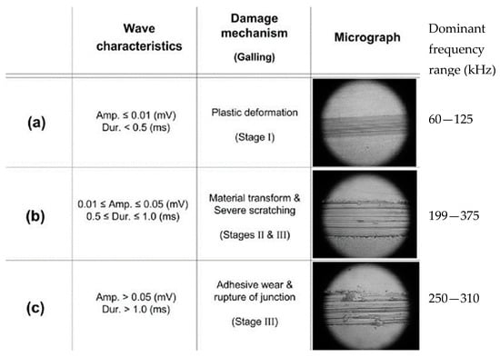 Wave characteristics for the three damage mechanisms and Dominant frequency ranges of the AE signals emitted during the three damage mechanisms. (a) stage 1 galling wear. (b) stage 2 and 3 galling wear. (c) stage 3 galling wear Reprinted/adapted with permission from [22].