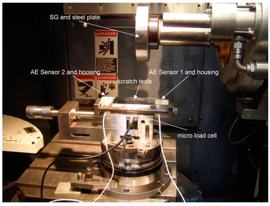 Moghadam et al. studied the AE of galling from a metal-forming point of view by using the bending under tension test. They used strips of 304 L stainless steel formed over a powdered metallurgy (PM) tool steel and two different lubricants and found the AE signature for galling to be 20 to 160 kHz [18]. Hase et al. conducted research to distinguish between abrasive and adhesive wear mechanisms using AE monitoring techniques. Hase et al. reported the frequency peak of the AE signals occurs at around 1100 kHz for adhesive wear, whilst the frequency peaks are distributed in the region from 250 kHz to 1000 kHz for abrasive wear; thus, wear mechanisms can be recognized from the features of the AE frequency spectrum. Shanbhag et al. investigated wear in stamping and showed that adhesive wear ranged from 100 to 500 kHz, and abrasive wear from 100 to 200 kHz [19]. Chen et al. and Griffin investigated the AE response of different aerospace materials (NI-based alloys and steel alloys) when undergoing single grit scratch tests [20,21]. By analyzing the AE signal with Short-time Fourier Transform (STFT) methods, Chen et al. and Griffin showed that each of the four materials resulted in distinct frequencies from 100 kHz to 575 kHz. This result contradicts the findings of Hase et al., which state that all materials should behave similarly. For the SG tests, the prominent AE feature frequencies of the scratches are expected to fall in the range 100~550 kHz, which are similar to the AE feature frequencies in grinding tests experienced in previous work.