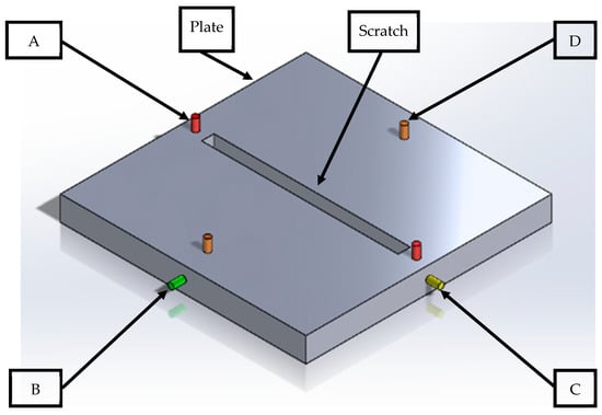 Schematic of test sensor positions. A = on the scratch face parallel to the scratch direction (red markers). B = on the “edge” of the sample perpendicular to the scratch direction (green markers). C = on the “edge” of the sample parallel to the scratch direction (yellow markers). D = on the scratch face perpendicular to the scratch direction (orange markers). Note measurements from orientation D are not used in this work.