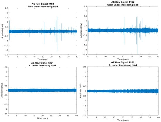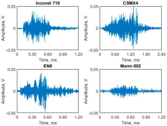 Figure 20 shows the raw data for the AE response of the four materials used in the SG tests, which display observable differences for the time–domain when considering SG and different material interactions. This is important in respect to the argument that different material interactions give off different ranges of acoustic energy.