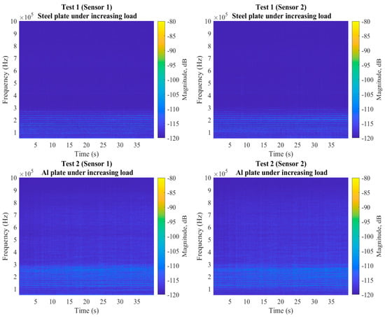 STFTs for scratch tests of tool steel indenter on steel sheet (top) and tool steel on aluminium sheet (bottom) under increasing load.