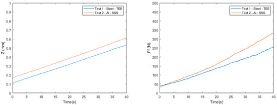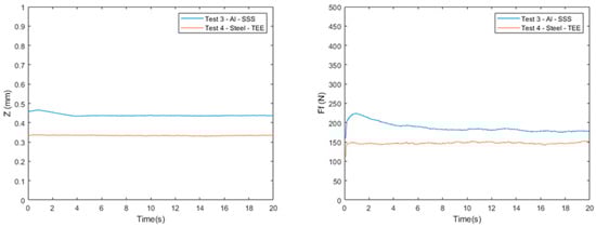 The STFT spectrograms (Figure 13) for the constant load tests showed dominant frequencies in a low-frequency region (below 300 kHz), which were persistent throughout the duration of the test for all tests and are therefore attributed to machine noise. The steel/steel tribopair does not appear to show any significant activity above the noise (greater than 300 kHz) except for a few peaks at 17 s, 24 s, and 27–30 s, which correlates well with the AE events seen in the raw data, Figure 12. There appears to be much more activity in the steel/aluminium tribopair, which has been attributed to greater interaction between the indenter and workpiece/plate materials, as evidenced by the deeper penetration depth into the aluminium sheet and higher measured friction as shown in Figure 14.