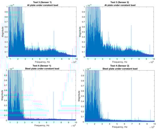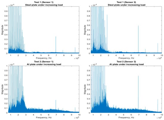 The FFT analysis shows (Figure 9) substantial activity below 300 kHz, as expected from the noise seen in the STFT analysis, as well as three dominant peaks at approximately 700 kHz, 800 kHz, and 950 kHz for both plate materials.
