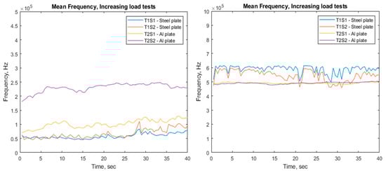 Figure 10 (left) shows that the mean frequency for the steel plate exhibits lower mean frequency than the aluminium plate with a gentle increase across the duration of the test. The aluminium also exhibits this increase in mean frequency with increasing load. Figure 10 (right) shows the mean frequency after a high pass filter at 300 kHz has been applied to the signal, which now shows the steel plate exhibiting a higher mean frequency (approximately 600 kHz) than the aluminium (500 kHz). The mean frequency for the steel appears to gently decrease with increasing load, whilst the aluminium gently increases with increasing load after this filter has been applied.