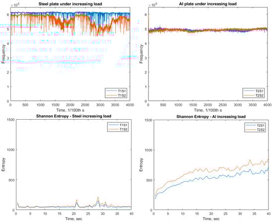 The Shannon entropy showed an increase with increasing load for the aluminium sample. This increase is not seen in the corresponding increasing load test of the steel sample. It is interesting to note the large difference between the two sensors for both samples when under constant load.