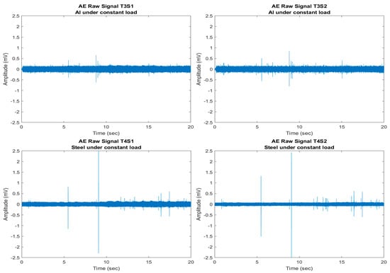 Figure 12 shows the raw AE signal from the constant load scratch tests. Again, the steel plate exhibits several distinct AE events (as also shown in the increasing load tests), whilst the aluminium this time does show some AE events of smaller magnitude (than the steel) but more than the increasing load tests. For these tests, the sensors were in orientation C for both samples (on the “edge” of the sample parallel to the scratch direction).