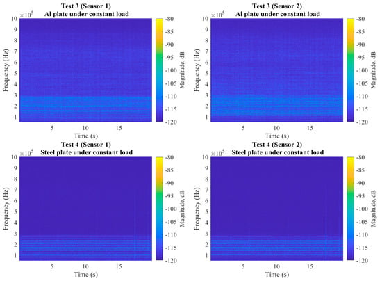 In the STFT spectrograms (Figure 7 and Figure 13) for both increasing and constant load, there appears to be a difference between the steel/steel tribopair and the steel/aluminium tribopair, with the latter (steel/aluminium) showing much more activity in the frequency range above 300 kHz. In comparison to the SG tests, the scratch tests exhibit much more noise.