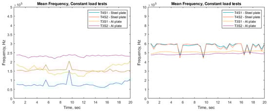 When mean frequency is considered, Figure 16 (left) shows the steel plate samples exhibit a lower mean frequency than the aluminium plates across the duration of the test. It is difficult to see if there is a correlation between the constant load and mean frequency, as there are occasional peaks and troughs in the data. The overlap between two tests, Test 3 and Test 4, makes it difficult to comment on a difference in materials. However, once the mean frequency is recalculated after a 300 kHz high pass filter is applied to the data Figure 16 (right), the steel plate once again exhibits a higher mean frequency (600 kHz) than the aluminium (500 kHz) across the duration of the test; this is similar to what was observed in the increasing load tests.