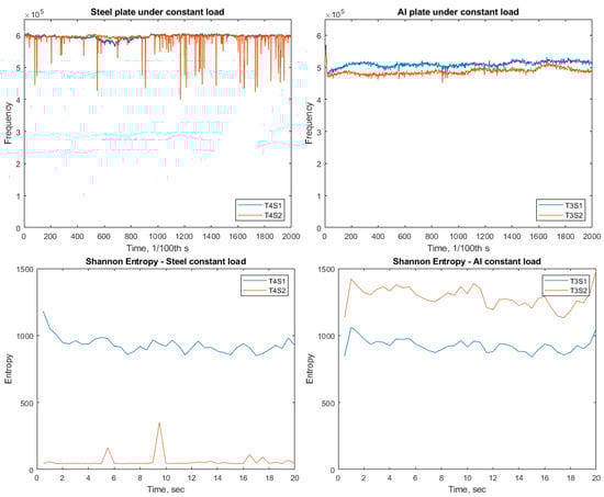 The centroid frequency (Figure 17, top) shows the steel typically has a higher centroid frequency (600 kHz) than the aluminium (500 kHz) throughout the duration of the constant load test, and the centroid frequencies for both materials remain almost constant. However, Shannon entropy (Figure 17 bottom) shows an increase with load for the aluminium sample not seen in the steel sample.