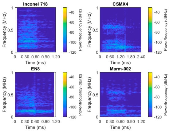 AE STFT for SG tests for Inconel 718, CSMX4, EN8, and MARM-002.