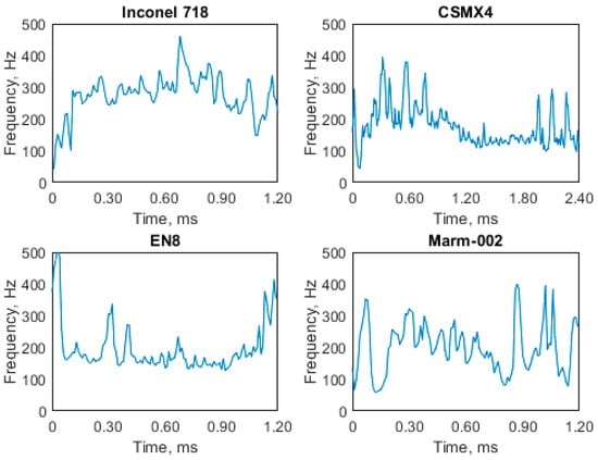 Centroid Frequency of the SG tests for Inconel 718, CSMX4, EN8, and MARM-002.