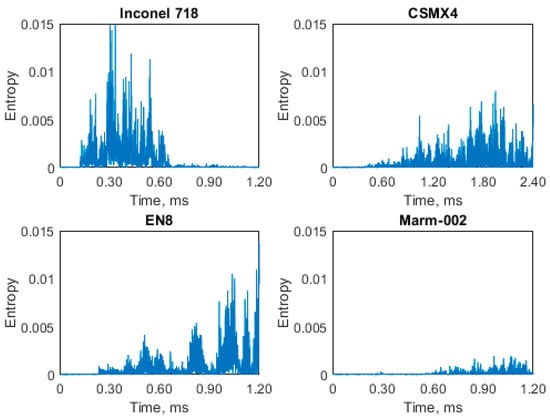 Shannon entropy of the SG tests for Inconel 718, CSMX4, EN8, and MARM-002.