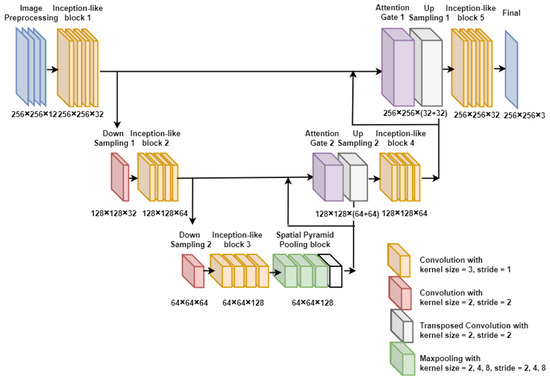 - Through an ablation study and a quantitative evaluation, this study demonstrates the advantages of using the image pre-processing block, the inception-like block, the spatial pooling blocks, and the proposed attention gate.