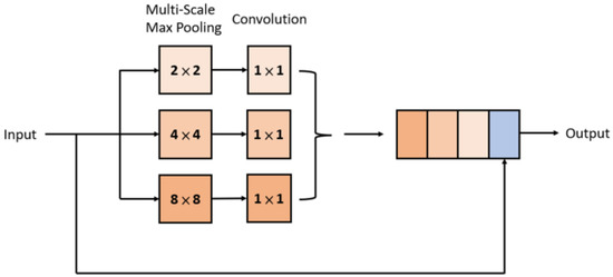 Maximum pooling was used to extract the obvious feature values in the feature maps. He et al. [26] used different pooling kernel sizes to extract feature values from the same feature map, from coarse to fine, to generate feature maps with different resolutions. In this way, without increasing the trainable parameters, it helps the shallower network obtain deeper network layers, thereby enhancing the effect of deep learning training. The SPP block in this study uses multi-scale maximum pooling with kernel sizes of , , and to extract features from coarse to fine. Because the resolution of the feature map shrinks after the maximum pooling, the results of each maximum pooling need to be upsampled by bilinear interpolation to the same resolution as the original feature map before they can be concatenated. Figure 3 shows the overall SPP block, which includes multiscale maximum pooling operations to extract features from coarse to fine.