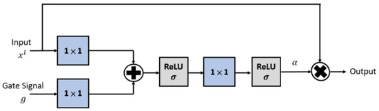 The original U-Net feature fusion involves directly concatenating the output of the transposed convolution and the output of the encoder with the same resolution, while Oktay et al. [27] proposed Attention U-Net to replace the direct concatenation part with the attention gate; that is, the same spatial dimension of the feature maps needs to be multiplied by the same attention coefficient between 0 and 1, as in Equation (6). This attention mechanism is beneficial for automatically highlighting salient regions for semantic segmentation.