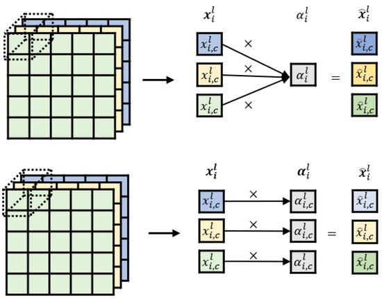 where is the spatial dimension, is the channel dimension, is the layer, is the input, is the attention coefficient, and is the output.