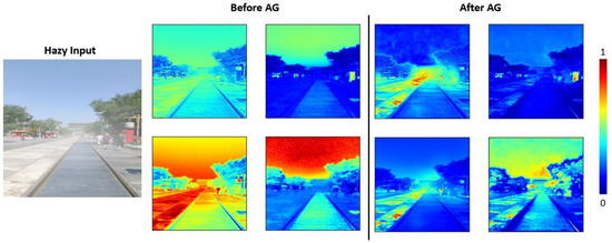 Figure 6 shows that the attention gate calls attention to objects of distant buildings, ground textures, trees, and pedestrians that are blurred due to haze. The feature map after the attention gate changes the gain by the attention coefficient to achieve the effect of focusing on objects with complex structures and suppressing objects with relatively simple structures, such as focusing on the characteristics of pedestrians and suppressing the characteristics of the sky.