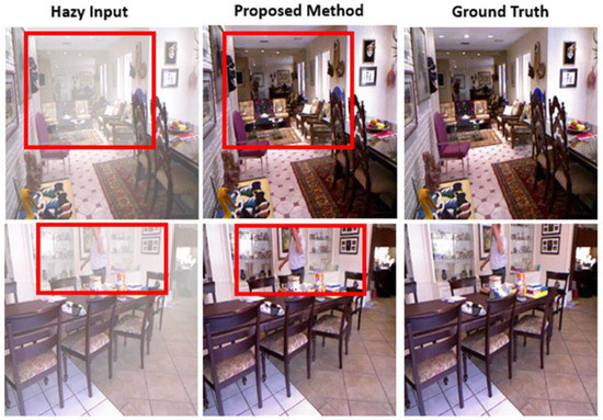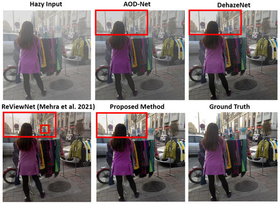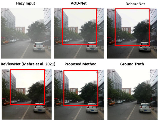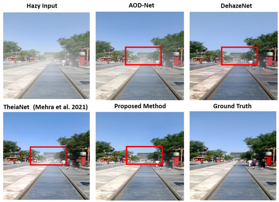 Some comparisons between the dehazing results of the RESIDE SOTS indoor and outdoor testing datasets and ground truth are demonstrated as follows. Figure 8 illustrates the indoor dehazing results. The box indicates the key recovery area where the image is not clear due to the haze. It can be seen from the results of the image dehazing that people and furniture in the distance were affected by color deviation and low contrast were well-restored and were almost the same as the ground truth. Similarly, Figure 9 shows the restoration of traffic signs, cars, and sky regions blurred by haze in the outdoor environment. AOD-Net [10] and DehazeNet [9] cannot recover the color deviation or the contrast well. ReViewNet [28] generates a darker image than ground truth and cannot restore the appearance of the no parking sign. The proposed method effectively removes the haze on buildings, sky, and traffic signs. The same dehazing effect was also achieved for images with buildings and trees, as shown in Figure 10. It shows that ReViewNet [28] generates a darker dehazing result due to a color deviation problem. As illustrated in Figure 11, removing haze for objects far in the distance is a limitation of TheiaNet [20]. Obviously, the proposed method generates a clearer dehazing result for distant buildings than the other models. For a real hazy image, the proposed method achieves a visually pleasing result compared to those of the other models, as shown in Figure 12.