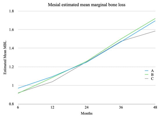 Regarding Implant 2, as shown in Figure 2, a 3 (groups) × 5 (time) MANOVA revealed a main effect of time (F(1, 44) = 680.31, p < 0.001), while other effects did not reach the conventional threshold of statistical significance. In other words, the MBL for Implant 2 tended to increase over the five time periods, regardless of the surgical approach (i.e., group) (Figure 2).