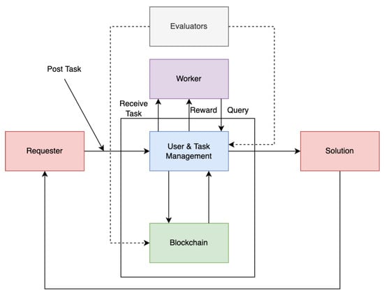 The concept of crowdsourcing has become more prevalent as a result of its growing popularity [1]. Crowdsourcing systems are being used by an increasing number of businesses and individuals to outsource jobs and attract workers all over the globe. Crowdsourcing is a concept that involves people or organizations utilizing the skill pool available on the Web to perform a task. This is usually carred out in the form of an open call. This low-cost, quick approach has been widely utilized for data analysis tasks, including sentiment analysis, image labeling [2], as well as object recognition [3]. This has enormous implications for global resource redistribution and societal sustainability.The concept of crowdsourcing comprises three groups of responsibilities: requester, worker, and crowdsourcing platform. The majority of existing crowdsourcing platforms, such as Freelancer [4], Fiverr [5], 99designs [6], Utest [7], and others, use a centrally managed approach, which means that all operations are handled by a single centralized authority. The people or organizations in charge of the platform are referred to as the “central authorities” in this context. As part of the process of completing a task via the platform, the central authority charges a fee. There is also a presumption that the central authority is credible, which must always be correct [8]. There may be threats to the central authority by intruders or insiders who maliciously modify data [8]. Furthermore, the user may have concerns about privacy and how their information will be utilized. In rare cases, user certification authorities have been proven to be untrustworthy [9]. However, crowdsourcing systems are vulnerable to the flaws of the obsolete trust-based paradigm, which poses certain unavoidable drawbacks. To begin with, typical crowdsourcing systems are subject to DDoS, hijacking remotely, and malicious attacks, rendering the services inaccessible. The bulk of previous research has tackled this from the standpoint of a centralized crowdsourcing platform [10]. Furthermore, much attention has been drawn to reputation-based crowdsourcing, where the requester selects workers based on their reputation score. This approach has the tendency of promoting collusive behavior between the requester and worker to boost the reputation score as compared to the exploration-based approach where we explore groups of workers who show interest in the published task, study their learning behavior, estimate their progress, and further analyze their performance patterns to aid the selection process. Here, the requester selects the most suitable solution and awards the incentive to the related workers. This approach promotes open innovation where the diversity of the skills available allows for more innovative ideas to be explored and also prevents the starvation of low-reputation workers. Several works have been conducted to address some of the above-mentioned drawbacks in crowdsourcing systems. To safeguard privacy protection, cryptography and differential privacy (DP) are utilized [11,12]. To counter “falsified” and “unrestricted” behavior, reputation-based techniques have been developed [13,14,15]. The bulk of these studies, however, are based on reputation-based crowdsourcing models, which can be improved further. Until present, no existing work has addressed all the above challenges at the same time.