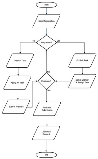 Using asymmetric-key encryption methods, our system ensures the anonymity of job submissions. Submissions are only accessible by the evaluators and the requester and will not be shared with anyone else. On the other hand, our platform ensures users’ pseudo-anonymity by disassociating their account from their individually identifiable information. The blockchain has left a legacy of pseudo-anonymity. For privacy, Ref. [33] avoids associating transactions from different activities. However, this would result in a lack of confidence in the platform. Because a user’s previous behaviors are unknown to other users, it is possible for them to mislead others on the site.