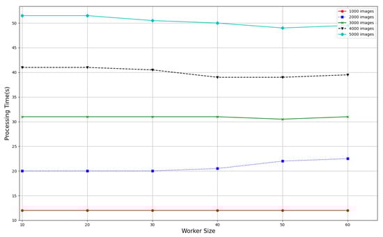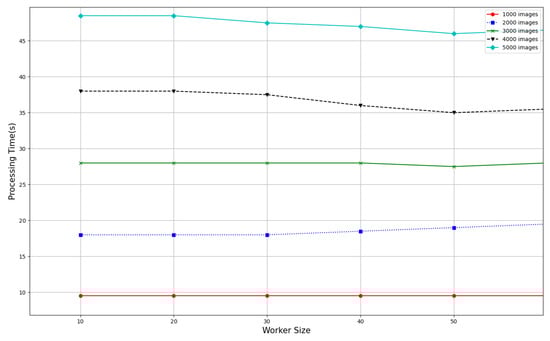 Processing time for image evaluation with and varied worker sizes (WITHOUT BLOCKCHAIN).