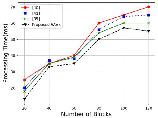 Figure 12 and Figure 13 illustrate a comparison of the proposed system in terms of registration time and processing overhead with three existing ones, namely PrivCrowd: A Secure Blockchain-Based Crowdsourcing Framework with Fine-Grained Worker Selection [40], CrowdR-FBC: A Distributed Fog-Blockchains for Mobile Crowdsourcing Reputation Management [41] and An Incentive and Reputation Mechanism Based on Blockchain for Crowd Sensing Network [35]. For starters, the proposed system is analyzed for its typical registration times. By altering the number of blocks, it has been shown that the proposed task takes less time to execute than the existing systems. Thus, the performance is evaluated depending on the amount of time it takes to process the data.