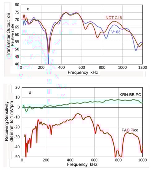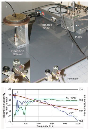 Figure 2a. The V103 transmitter was attached to a PVC plate edge with two U-shaped jigs (see insert photograph for an enlarged view). The KRN receiver was positioned vertically using a large U-shaped holder, which was held with brass plates. The total force on the sensor tip was 10.5 N. Another method for asymmetric wave generation used a point-contact transmitter (KRNBB-PCP transducer with 1-mm diameter active area, KRS Services, Richland, WA, USA), mounted vertically on a plate. Contact location was either in the middle of a large plate or within 5 mm from an edge. This was also used with edge mounting. These transmitters were usually driven by high-voltage pulses (280–320 V) or by low-voltage (±20 V) pulses from a waveform generator with an amplifier. Single sinewave and Gaussian pulse shapes were used depending on the degree of attenuation. These low-voltage pulses were tried when a certain frequency range was targeted, but some tests resulted in unsatisfactory outcomes due to weak signals. Longer sinewave excitation was used on a large Al plate, as will be subsequently described. The transmitting sensitivities of V101 and NDT C16 are shown in