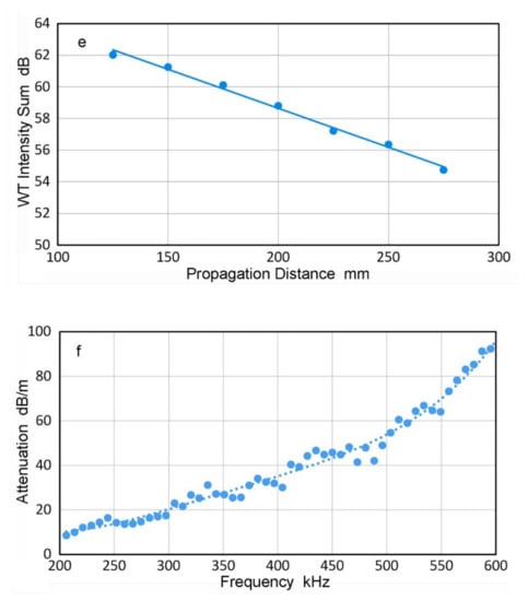 50]. The receiving sensitivity to Rayleigh waves was approximately 10 dB lower than that for normally incident waves. Lower peak-displacement values were found for tests with highly attenuating media, such as PMMA, PVC, and HDPE. Generally, Al, steel, and glass had higher values, but the peak levels varied. A part of this variation must be from the coupling of the transmitter to a plate. For attenuation measurements, maximizing Lamb-wave intensity is not critical as long as stable and adequate coupling is established. Note that sufficient signal qualities were obtained, allowing WT spectral analyses even with the peak displacements of 10–15 pm.