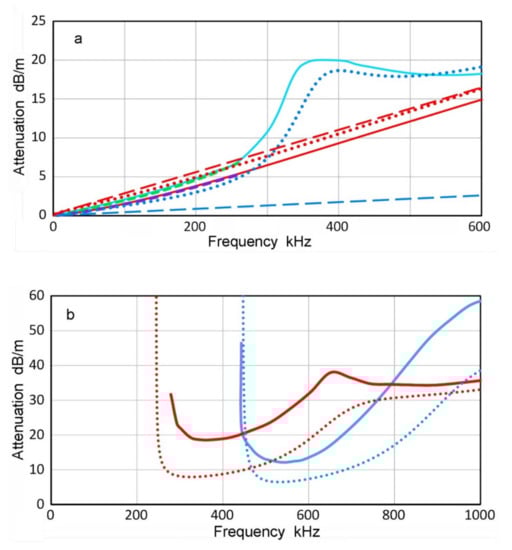 19]. In addition to velocity dispersion curves, parametric equations of attenuation of Lamb and Rayleigh waves were given. Around 1970, the GW dispersion curves of only a few materials (including Al, steel, and polymethyl methacrylate (PMMA)) were commonly accessible [