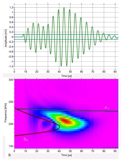 Figure 2a for the asymmetric mode (and its equivalent for the symmetric mode that uses a C-clamp) can conduct the two-surface sensing by turning over the plate with the transmitter attached. Care was needed to keep the transmitter attachment undisturbed while flipping after the completion of measurements on one side. The receiver was now positioned on the back side and transmitter connection was reestablished, followed by back-side detection. This two-surface method was not used when two point-contact transducers were used as transmitter and receiver. At later stages, a different sensor attachment method allowed the use of the two-surface detection as well. Differences of the detected signals on two sides were used for further signal processing in asymmetric cases, whereas signal summation was used to enhance symmetric wave signals. Time shifting of a few tenths µs to up to 1.5 µs was needed to match the signal pair for the same or opposite phase for the symmetric and asymmetric modes, respectively. The value of 1.5 µs was only required for lower frequency signals below 100 kHz, so it is a small fraction of the wave period. Time shifting was applied at the peak location. This need resulted mainly from the lack of symmetry in the transmitter attachment. In the case of asymmetric wave generation, signal paths were different by design. Complete suppression of unwanted mode cannot be achieved, and time-based discrimination was also applied using the wavelet transform analysis method. For the symmetric wave analysis, signals were truncated when the main asymmetric wave (usually A