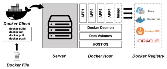 As shown in Figure 4, applications create, control, and manage containers through Docker Daemon (network, data volume, image, and container) of the Docker Engine. Although Docker Daemon operates on the host machine, the operator does not directly touch the Daemon, and the Docker Client interacts with the Daemon through the Docker CLI. A Docker File is a text file configured to build a Docker Image. Using commands, image files are added and copied, commands are executed, and ports are exposed. The Docker file is configured from the base image declaration to start the process command. Several command types are provided [35].