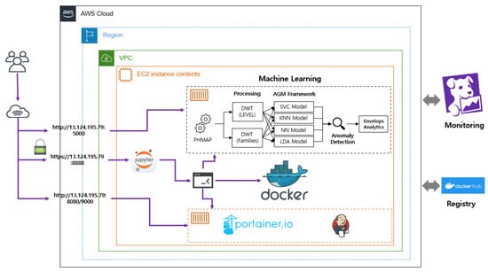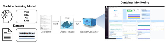 As shown in Figure 11, the implementation goals and scenarios are divided into three phases. First, the machine-learning model is packaged as a Docker image and is then built and run as a Docker container. Monitoring is conducted using a Datadog.