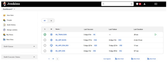 As shown in Figure 7, Jenkins is a tool that automates a build distribution, and the user can check the execution time of the batch jobs. Jenkins is automated to run the Docker Build/Run—a machine-learning defect determination application shown in Figure 8—and push it to the Docker Hub server, which is an image registry [37].