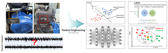 The target data used in the machine-learning modeling shown in Figure 10 are the time-series data for the state of a two-channel bearing. This problem must be classified into a total of four modes (one normal and three defective), and 30 feature values were extracted through feature extraction (data source: PHMAP 2021 Asia Data Challenge). Four machine-learning models were trained on the above data. The machine learning used lightweight models such as a support vector classifier (SVC) [23], linear discriminant analysis (LDA) [20], neural network (NN) [30], and K-nearest neighbor (KNN) [21,22].