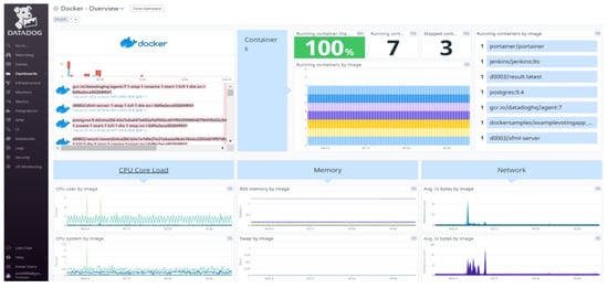 As shown in Figure 13, we built a monitoring system by linking DataDog to the monitoring part, which is a weakness of the Docker Container-based platform. DataDog has been proven to be a comprehensive cloud monitoring service for the Docker Container life cycle and server resource management used in a cloud environment.