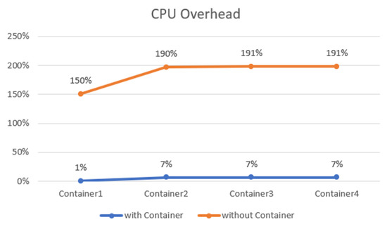 As shown in Figure 14, when Docker Container is not used, the CPU overhead increases from a minimum of 150% to a maximum of 191%, and when Docker Container is used, the optimal performance increases from a minimum of 1% to a maximum of 7%. This shows that Docker Container can handle a load while reducing the CPU usage, allowing the device to operate optimally without loss.