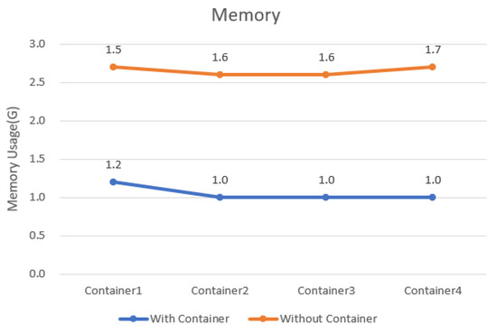 Figure 16 confirms that there is no significant difference in terms of memory usage. However, it was verified that the memory usage rate in the cumulative execution part—similar to the execution time—shows a gradually stable usage rate when Docker Container is used. The container has a much lighter operation than the existing virtualization technology, shares the OS kernel, and uses significantly less memory. This is thought to be due to the IT operation team operating a large number of systems, which has many advantages because it uses resources in a unit with much less memory usage.