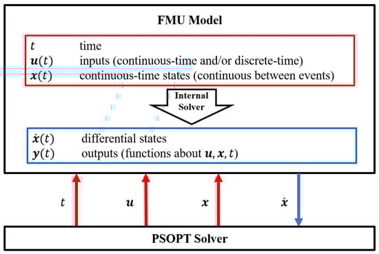 FMU is a black-box model used here to replace the analytic RHS equations; the input and output flows are presented in Figure 3. According to Figure 3, the FMU model, where the inputs are the present time t, the present controls u, and the present states x, can derive the present differential states by the internal solver. Therefore, it can be applied to the OCP solver as the RHS equations, and the difficulty in expressing the RHS equations is overcome.