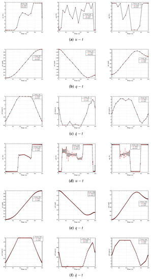 where J is the index, which is the function we aim to optimize. and L are the boundary cost function and process cost function. The performance index of the minimum-time trajectory planning problem discussed in this paper belongs to a boundary cost function, and the the process cost function equals zero. and are the start time and the end time, respectively. u represents the controls in the system, and refers to the output torque of the joint actuators in the robotic dynamic system. x represents the states in the system, and refers to joint angles and joint velocities in the robotic dynamic system. represents the differential states, and refers to joint velocities and joint accelerations in the robotic dynamic system [27].