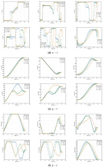 The boundary conditions give constant boundaries of the controls and the states. It is noted that the motors in the robot are modeled as ideal voltage–torque converters without any dynamic effects; in other words, there is a linear relationship between voltage and torque. The linear converter coefficient can be found in [26].