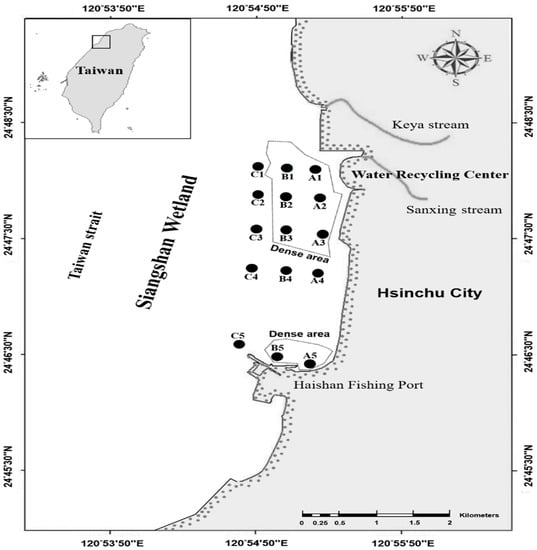 The coastline of the Siangshan Wetland is approximately 8 km long with a total area of approximately 1600 ha []. It is a breeding ground for shrimp, crabs, shellfish, and benthic organisms [,]. Since 2001, the Siangshan Wetland has been officially designated as the Hsinchu City Coastal Wildlife Sanctuary. The study area is situated north of the Sanxing stream and south of the Haishan Fishing Port in Hsinchu, Taiwan. A map of the study area is depicted in Figure 1.