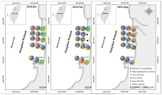 Three crab species, namely, U. arcuata, U. borealis, and M. banzai, were observed at the sampling sites within the mangrove region before mangrove removal (Figure 2). After mangrove removal, U. arcuata, U. borealis, and U. lacteal were also observed. This indicates that U. lacteal returned to this area after mangrove removal. U. arcuate, U. lacteal, and U. borealis were generally found in mangroves, salt marshes, and sandy or muddy areas in the Siangshan Wetland.