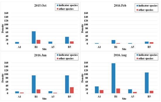 Densities of indicator species and other species at four sites, A1, B1, A5, and B5, in October 2015 and February, June, and August 2016.