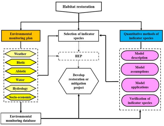 The habitat evaluation procedure (HEP) for formulating a restoration or mitigation project was developed and is shown in Figure 4. Firstly, this procedure combines the quantitative method of the indicator species from the environmental monitoring plan to select ISs. Second, it analyzes the relationship between the species and the environment after the selected ISs. The biological coefficient can be obtained with the environment or biological parameters with engineering. Finally, this information can be used to develop rehabilitation or recovery plans.